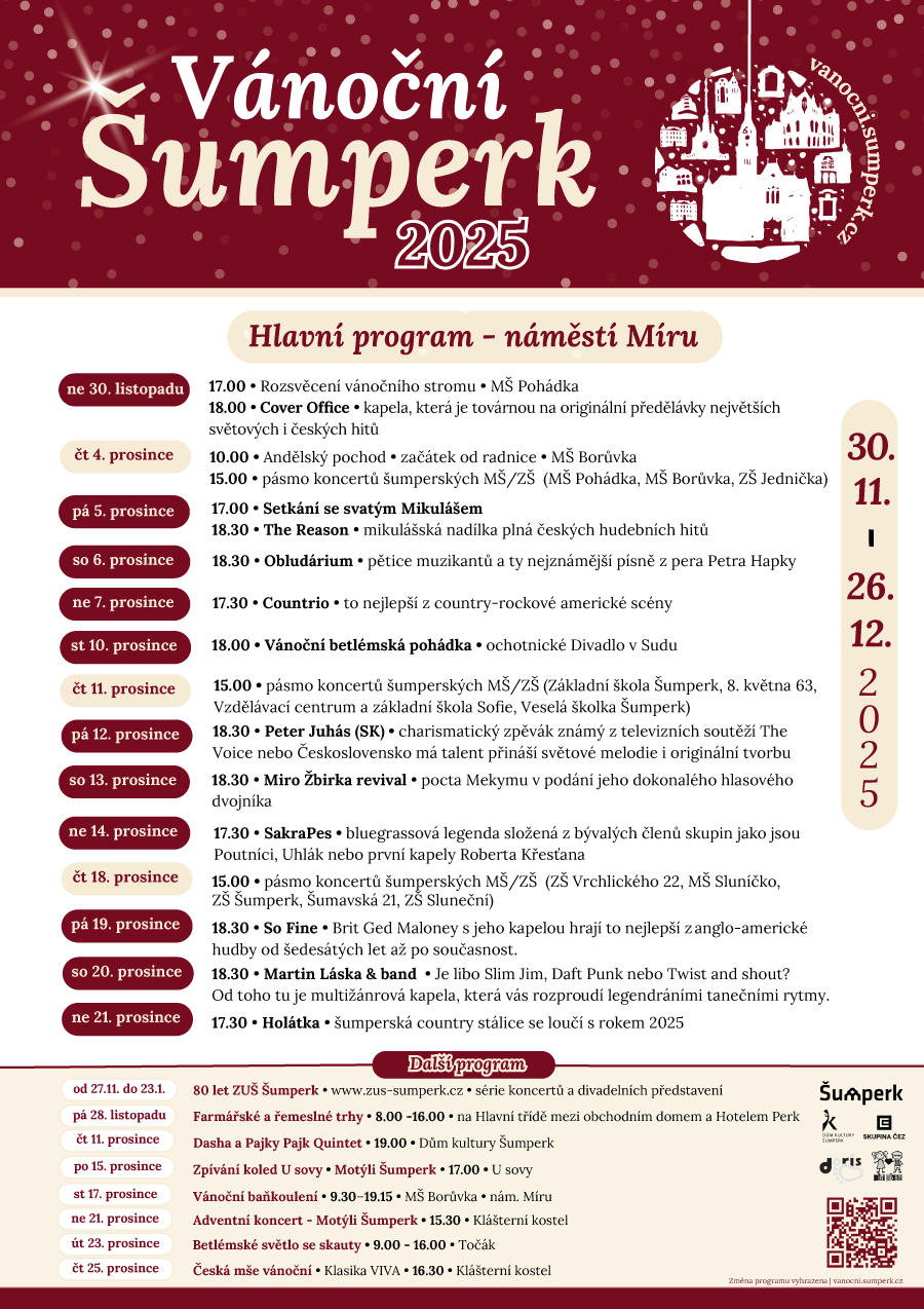 Prostranství před šumperskou radnicí bude letos již počtvrté hostit akci Vánoční Šumperk. Atmosféru na tržišti navodí především kulturní program, tradiční stánkový prodej i vánoční výzdoba. Děti se mohou opět těšit na Ježíškovu nebeskou kancelář a andělská křídla.